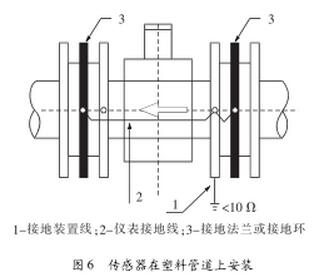 (2)傳感器在塑料管道上或在絕緣襯里的管道上安裝時,如圖6,傳感器兩端必須安裝接地環或接地法蘭。使管內流動的被測介質與大地短路,具有零電位,否則污水流量計無法正常工作。