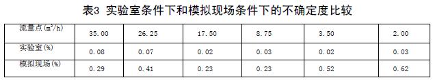 實(shí)驗(yàn)室條件下和模擬現(xiàn)場條件下的不確定度比較(表3)兩次結(jié)果可以看出,兩次實(shí)驗(yàn)各個流量點(diǎn)的不確定度差距非常大。可見,濃硫酸電磁流量計(jì)對安裝條件還是比較苛刻的。