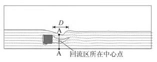 來自上游的水體經(jīng)浮體結構的阻擋作用,水流繞流經(jīng)浮體結構的上部和下部區(qū)域通過,并在浮體結構背水面的下游區(qū)域形成小范圍回流區(qū),此處水流紊亂,流速分布不均勻。試驗過程中,對回流區(qū)沿水流方向的長度D(水槽縱向中心斷面處,自浮體結構背水面到沿水流方向流速為0的*遠位置點)進行量測。選取浮體結構下游區(qū)域回流區(qū)中心點所在斷面進行流速測量對比。流速測量斷面位置A-A見圖3。
