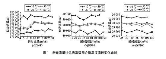 將實(shí)驗(yàn)測得的廢水流量計(jì)在不同溫度及流速下的儀表系數(shù)數(shù)據(jù)整理,特性曲線如圖1所示,3組曲線分別對應(yīng)DN40, DN80, DN100的3塊廢水流量計(jì)的儀表系數(shù)曲線。