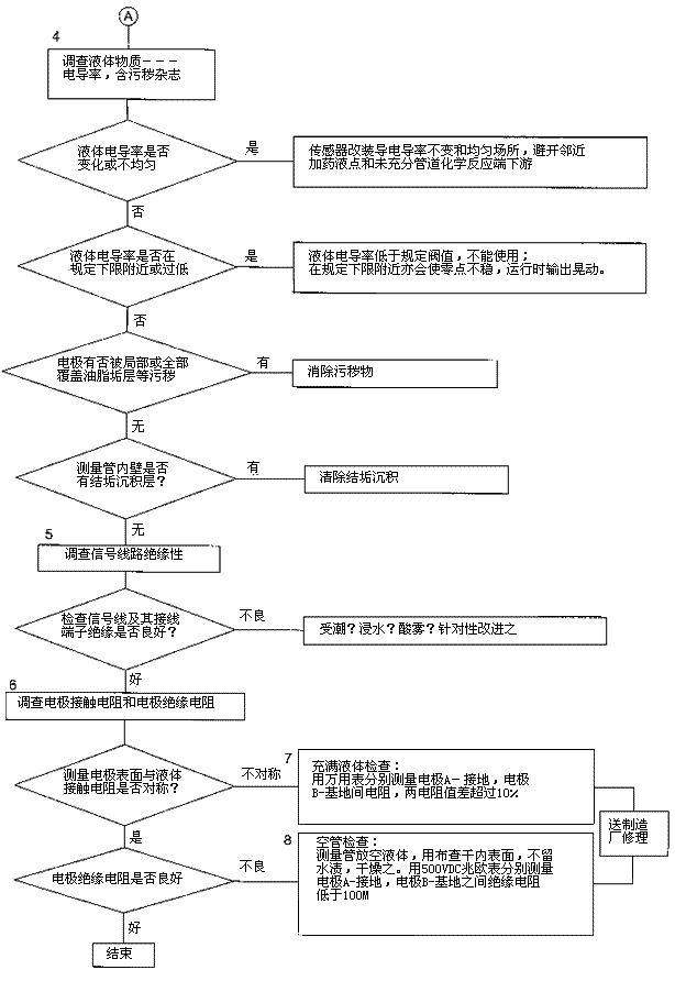 檢查流程圖*5項。信號回路絕緣下降會形成零點不穩(wěn)。信號回路絕緣下降的土要原因足,包極部位絕緣下降所引起的,但也不能排除信號電纜及其接線端子絕緣下降或破壞。因為有時候現(xiàn)場環(huán)境十分嚴(yán)酷,稍一疏忽儀表蓋、導(dǎo)線連接處密封不慎,彌漫著潮氣酸霧或粉粒塵埃侵入儀表接線盒或電纜保護層,使絕緣卜降。信號回路絕緣電阻檢查分別按電纜側(cè)和流量傳感器側(cè)兩郵分進行,用兆歐表測試。因信號電纜容易可先做。流量傳感器再分兩次進行:充滿液體測黽電極表面接觸電阻和個管后測量,U極絕緣電阻。