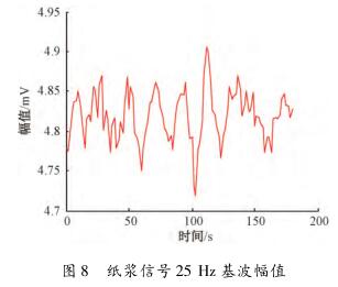 在頻域中對(duì)紙漿信號(hào)觀察時(shí)發(fā)現(xiàn),紙漿信號(hào)的漿液噪聲頻帶在零頻率點(diǎn)附近,距離流量信號(hào)基波頻率點(diǎn)較遠(yuǎn),對(duì)基波幅值和各奇次諧波幅值基本沒有影響,紙漿信號(hào)在頻域中的圖形如圖7所示。選擇一組采集的紙漿信號(hào),把其等分成數(shù)段,利用MATLAB計(jì)算每段數(shù)據(jù)在基波處的幅值并提取保存在一個(gè)數(shù)組中,使用繪圖工具畫出來,如圖8所示??梢?,基波幅值在4.7~4.95mV變化,波動(dòng)較小。因此,提取到的與流量相關(guān)的感應(yīng)電動(dòng)勢信號(hào)幅值會(huì)比較穩(wěn)定。