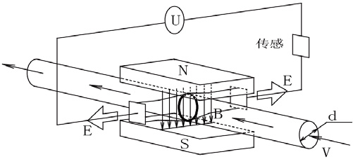 如圖,測量流量時,流體流過垂直于流動方向的磁場,導電性流體的流動感應出一個與平均流速成正比的電勢。其感應電壓信號通過兩個電極檢出,并通過電纜傳送至轉(zhuǎn)換器,經(jīng)過信號處理及相關(guān)運算后,將累計流量和瞬時流量顯示在轉(zhuǎn)換器的顯示屏上。