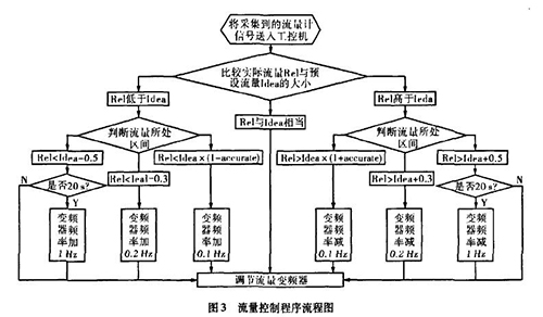 實際生產(chǎn)中流量一直在某個區(qū)域內(nèi)波動,且其動態(tài)特性不易掌握。從上面的理論中我們能夠讓誤差△£盡可能的小,這樣距我們所需要的理論值%就越接近。而減小誤差需要我們把n取的盡可能大,也就是在生產(chǎn)時間內(nèi)劃分更多的周期去調(diào)節(jié)流量。當工控機根據(jù)稀硝酸專用流量計傳送回來的信號發(fā)出調(diào)節(jié)變頻器工作頻率的指令后,電機調(diào)整功率到稀硝酸專用流量計的實際測量為一個工作周期,我們知道從指令發(fā)送到實際測量值返回有一個較大的滯后,如果調(diào)節(jié)的周期時間小于流量計本身的一個工作周期,那么顯然不可能達到減小誤差的目的。利用模糊控制思想H。,在控制程序中我們把流量的波動區(qū)域劃分為±缸×Yo,Yo-t-O.3,Yo±0.5四個區(qū)域,其中缸為可調(diào)節(jié)的誤差范圍,生產(chǎn)中我們?nèi)?.015,流量區(qū)域劃分的單位均為t/h。針對不同的區(qū)域采取不同的調(diào)整方案。具體流程如圖3所示。圖中變量Rel表示實際測量的流量,變量Idea表示理論流量。
