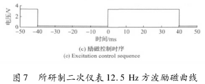 其次,采用本文研制的二次儀表匹配一次儀表進行勵磁。勵磁電流穩態值設定為178mA,遲滯比較電路的閾值上限設定為205mA,閾值下限設定為165mA。方波勵磁頻率設為12.5Hz,低壓勵磁電源設定為17V。示波器采集繪制得到的勵磁結果曲線如圖7所示。其中圖(a)為勵磁電流曲線;圖(b)為恒流控制電路中,恒流源的輸入輸出端電壓幅值曲線;圖(c)為單路勵磁時序控制信號。從曲線(b)可以看到,在勵磁系統切換至低壓供電時,由于三端穩壓芯片的負載感抗較大,其輸出調節需經歷過渡過程,待輸入輸出壓差穩定后,勵磁電流隨后進入穩態,進入穩態所需時間約為13ms。