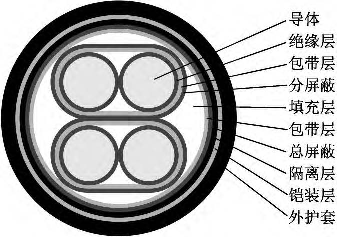 該新型電纜的結(jié)構(gòu)如圖1所示。導(dǎo)體為單股退火鍍錫軟銅線,以提高導(dǎo)體的導(dǎo)電性和防腐蝕性。在導(dǎo)體外繞包一層?。疲矗ň鬯姆蚁┌雽?dǎo)電帶,有利于降低導(dǎo)體和絕緣之間的摩擦起電噪音。絕緣采用材料較為純凈、介電常數(shù)較小、具有一定彈性的聚丙烯絕緣級材料,并采用擠壓式擠出,減小絕緣層與導(dǎo)體的間隙。采用對絞組作為信號傳輸線,由于在兩根傳輸線上感應(yīng)的電壓接近相等,減小了電壓差值,提高了信號傳輸穩(wěn)定性;對絞組由兩種不同顏色絕緣線芯組成,相鄰線對對絞節(jié)距應(yīng)不大于100mm。對絞分屏蔽組(即對對絞組進(jìn)行分屏蔽,每對對絞組外繞包兩層聚酯帶和一層厚0.04mm鋁塑復(fù)合帶繞包,內(nèi)置一根7×0.26mm鍍錫銅絞線作引流線)有利于對不同對絞組之間信號串音的抑制和隔離。對絞分屏蔽組同心式絞合成纜,在對絞分屏蔽組間填充非吸濕性材料,以保證纜芯圓整。在成纜纜芯外繞包兩層聚酯帶,再采用鋁塑復(fù)合帶繞包,內(nèi)置鍍錫銅線作引流線,以提高電纜電磁屏蔽能力??偲帘螌油鈹D包隔離層(隔離護(hù)套),隔離層采用絕緣級低密度聚乙烯材料。隔離層外采用鎧裝層,鎧裝材料為高導(dǎo)磁合金鋼帶,其為強(qiáng)磁材料,可將外來的磁通大部分限制在鎧裝層的外表面上(僅有少部分能進(jìn)入被屏蔽的空間);鎧裝時(shí)對高導(dǎo)磁合金鋼帶采用縱包焊接,確保其形成一連續(xù)圓柱管;鎧裝層可提高電纜抗電磁干擾水平以及對電纜進(jìn)行加強(qiáng),減少電纜振動引起的電動勢。外護(hù)套采用藍(lán)色軟PVC(聚氯乙烯)護(hù)層級電纜材料擠包,實(shí)現(xiàn)電纜防護(hù)。