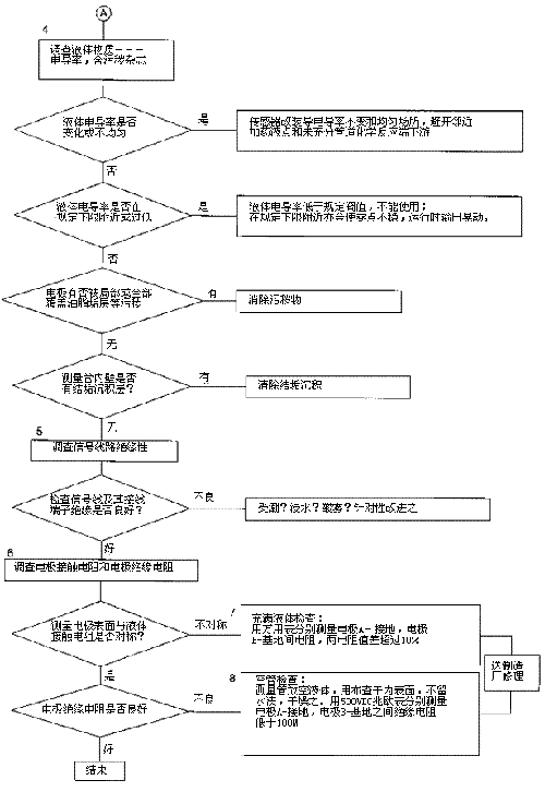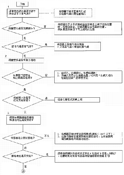 檢查流程圖*5項。信號回路絕緣下降會形成零點不穩(wěn)。信號回路絕緣下降的土要原因足,包極部位絕緣下降所引起的,但也不能排除信號電纜及其接線端子絕緣下降或破壞。因為有時候現(xiàn)場環(huán)境十分嚴酷,稍一疏忽儀表蓋、導線連接處密封不慎,彌漫著潮氣酸霧或粉粒塵埃侵入儀表接線盒或電纜保護層,使絕緣卜降。信號回路絕緣電阻檢查分別按電纜側(cè)和流量傳感器側(cè)兩郵分進行,用兆歐表測試。因信號電纜容易可先做。流量傳感器再分兩次進行:充滿液體測黽電極表面接觸電阻和個管后測量,U極絕緣電阻。