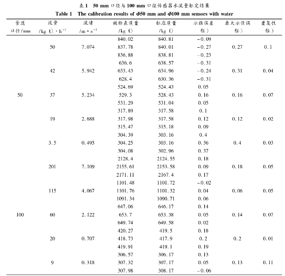 為了評測系統(tǒng)的實際應用效果,進行了水流量標定實驗。分別針對50mm口徑與100mm口徑的傳感器進行標定。系統(tǒng)勵磁方式采用方波勵磁,勵磁頻率為12.5Hz,管道*大流速為7m/s左右,*小流速為0.3 m/s左右,標定結果如表1所示。