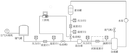 空氣壓縮機將空氣壓縮后送入儲氣罐,標準流量計1計量氣液混合前儲氣罐送入管道的氣體流量。蓄水罐距離地面30m,提供試驗所需的液相,其流量由標準流量計2測得。液相和氣相經混和器混和后送入試驗管段,*后流入分離罐將水和空氣進行分離,空氣由放氣閥排出,水由水泵送回蓄水罐循環使用。工控機對所有儀表數據進行采集和顯示并對兩個電動調節閥進行控制,調節氣相和液相的流量。