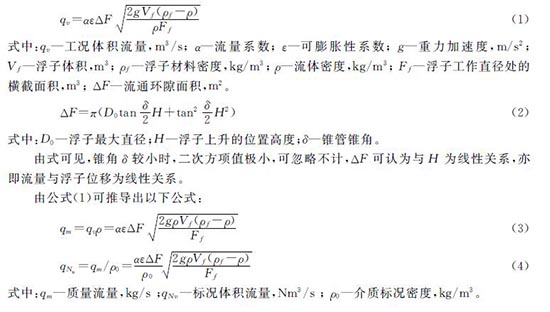 流量計垂直安裝在管道上,流體自下向上流經錐管,浮子在P1、P2差壓作用下產生上升或下移,當浮子此差壓(P2-P1)與浮子重力G、浮力F、粘滯力合力平衡時,處于平衡狀態(tài)。建立方程并推導(可參考相關專業(yè)資料,此處省略),忽略粘滯力影響,假設流量系數(shù)為常數(shù),可得出浮子位移與流量成線性對應關系。浮子流量計的流量方程為: