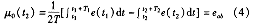 冷凍水計(jì)量表一般都采用工頻交流電源供電,其電源電壓的幅值和頻率的變化都會(huì)給冷凍水計(jì)量表帶來電源性干擾噪聲。對(duì)電源電壓的幅值變化,因采用多級(jí)集成穩(wěn)壓,一般而言電源電壓的幅值變化對(duì)電磁流量的測(cè)量精度影響不大。當(dāng)電源電壓的頻率波動(dòng)時(shí),雖然其波動(dòng)范圍有限,但對(duì)冷凍水計(jì)量表測(cè)量精度影響較大。為了解決工頻干擾問題,實(shí)現(xiàn)對(duì)流體流速感應(yīng)電勢(shì)e柚信號(hào)的準(zhǔn)確測(cè)量,需利用以下基本關(guān)系:①勵(lì)磁周期為工頻周期的整數(shù)倍,即勵(lì)磁頻率為50/nHz(n為偶數(shù));②正負(fù)勵(lì)磁下的同相位采樣。圖2是對(duì)應(yīng)低頻矩形波勵(lì)磁形式下的典型電勢(shì)信號(hào)形式,按上述關(guān)系在一個(gè)勵(lì)磁周期下,若假設(shè)t。和t:點(diǎn)為工頻干擾的等效干擾點(diǎn),且采樣寬度T=T1=T2,則e –ab的基本算式為:,