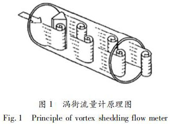 把一個阻流體垂直插入管道中,流體會繞過阻流體流動,并在阻流體兩側形成有規則的旋渦列,左右兩側的旋渦旋轉方向相反。沼氣流量計原理如圖 1 所 示。這種旋渦列稱為卡門渦街。根據卡門的研究,只有當渦列寬度 h 與同列相鄰兩旋渦的間距 l 之比滿足某個比例時,旋渦列才可以穩定存在。比如,對圓形阻流體,要求兩者比值為 0. 281。