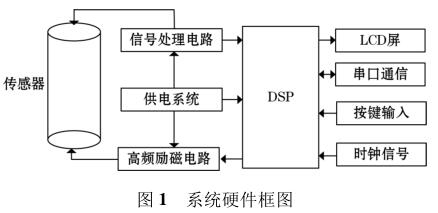 高頻勵(lì)磁防腐型電磁流量計(jì)由傳感器、高頻勵(lì)磁電路、信號(hào)處理電路等組成,其中高頻勵(lì)磁電路決定著傳感器磁場(chǎng)的強(qiáng)弱,勵(lì)磁電路的穩(wěn)定性以及精確性決定著系統(tǒng)檢測(cè)的準(zhǔn)確性以及穩(wěn)定性。DSP 系統(tǒng)控制勵(lì)磁電路激勵(lì)傳感器線圈,當(dāng)線圈中有導(dǎo)電液體流過時(shí),其切割磁感線并在傳感器兩端的線圈上產(chǎn)生感應(yīng)電動(dòng)勢(shì),利用信號(hào)檢測(cè)電路監(jiān)測(cè)感應(yīng)電動(dòng)勢(shì)的大小,*后根據(jù)相應(yīng)關(guān)系計(jì)算出液體的流量,系統(tǒng)硬件框圖如圖 1 所示。