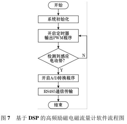 軟件流程圖如圖7 所示。軟件采用模塊化的設(shè)計(jì)方法,主要設(shè)計(jì)了勵(lì)磁控制切換程序、PWM 波產(chǎn)生程序、A/D 轉(zhuǎn)換程序以及 RS485 通信程序等。系統(tǒng)上電后*先執(zhí)行復(fù)位操作,利用 DSP 內(nèi)部的定時(shí)器產(chǎn)生PWM 波控制 H 橋電路中的勵(lì)磁方式,當(dāng)系統(tǒng)檢測(cè)到傳感器線圈輸出的感應(yīng)電動(dòng)勢(shì)后,利用 DSP 內(nèi)部的 12位 A/D 轉(zhuǎn)換器對(duì)此信號(hào)進(jìn)行模數(shù)轉(zhuǎn)換,*后根據(jù)相應(yīng)算法計(jì)算出管道中被測(cè)液體的流量。