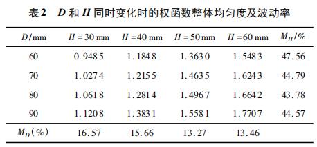 根據表 1 和表 2 權函數均勻度的波動率數值可以看出,MH > MD > ML,所以,矩形段 L,D,H 對于權函數均勻度的影響程度是依次增強的,高度 H 對權函數均勻度影響*大,寬度 D 影響稍小,長度 L 影響很小。且 D 和 H 越小,權函數整體均勻度 R 越小,權函數分布越均勻。