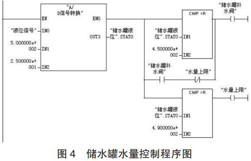 (2)程序設計。儲水罐水量控制的工作過程為:當壓力變送器檢測到儲水罐的水量低于 450kg 時,補水閥 3 開啟為儲水罐補水;當水量達到 490kg 時,補水閥 3 關(guān)閉;生產(chǎn)配制過程中,循環(huán)以上控制過程。儲水罐水量控制的程序如圖 4 所示。