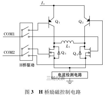 如圖2 所示,在對(duì)傳感器線圈進(jìn)行勵(lì)磁時(shí),通過比較器控制切換開關(guān)切換高低壓進(jìn)行勵(lì)磁。V ref 作為比較器的基準(zhǔn)輸入端,其表示勵(lì)磁電流的電壓穩(wěn)態(tài)值;而 C ur 則表示 H 橋勵(lì)磁電路中檢測(cè)到的電壓信號(hào)。一開始當(dāng)系統(tǒng)處于低壓勵(lì)磁狀態(tài)時(shí),系統(tǒng)會(huì)自動(dòng)斷開切換電路中的電流旁路,此時(shí)系統(tǒng)通過利用 H 橋向勵(lì)磁線圈提供恒定電流。當(dāng)勵(lì)磁方向變化時(shí),電流檢測(cè)電路就會(huì)檢測(cè)到電流變?yōu)樨?fù)方向,比較器的 C ur 端與V ref 端的平衡就會(huì)發(fā)生變化,此時(shí)系統(tǒng)通過比較器自動(dòng)切換為高壓勵(lì)磁狀態(tài)。與低壓勵(lì)磁方式相反,在此種狀態(tài)下,恒流控制電路關(guān)閉而電流旁路打開,線圈中的能量就會(huì)存儲(chǔ)在能量回饋電路中,此時(shí) C 1 端的電壓會(huì)超過高壓源。等勵(lì)磁線圈中的能量釋放完后,電流逐漸降為零,此時(shí)能量回饋電路就會(huì)利用電流旁路和 H 橋?qū)⒛芰糠答伣o勵(lì)磁線圈。當(dāng)電容 C 1 端的電壓下降到小于高壓源時(shí),系統(tǒng)就會(huì)自動(dòng)通過電流旁路和H 橋直接對(duì)勵(lì)磁線圈進(jìn)行勵(lì)磁,當(dāng)勵(lì)磁線圈中的電流超過設(shè)定閾值時(shí),C ur 端電壓就會(huì)大于 V ref 點(diǎn)電壓,此時(shí)比較器又會(huì)切換成低壓勵(lì)磁方式,如此反復(fù)循環(huán)控制,達(dá)到對(duì)勵(lì)磁線圈恒流控制的目的。圖 3 為 H 橋勵(lì)磁控制電路。