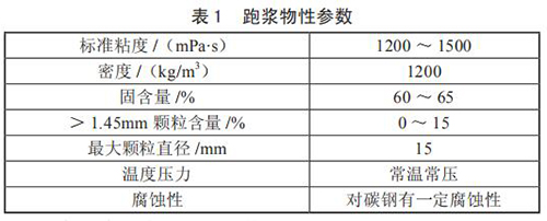 對(duì)跑漿進(jìn)行分析后發(fā)現(xiàn),跑漿是一種由煤漿和一些雜質(zhì)混合而成的半流體物質(zhì),當(dāng)甲烷流量計(jì)使用煤倉中煤堆中上部煤時(shí),由于煤質(zhì)較好,跑漿中小煤塊極少,性質(zhì)同正常煤漿,只是固含量稍高;而使用煤堆底部的煤時(shí),煤質(zhì)差甲烷流量計(jì)研磨不充分,跑漿中含有約 15% 的小煤塊,分析后的跑漿物質(zhì)參數(shù)如表 1 所示。