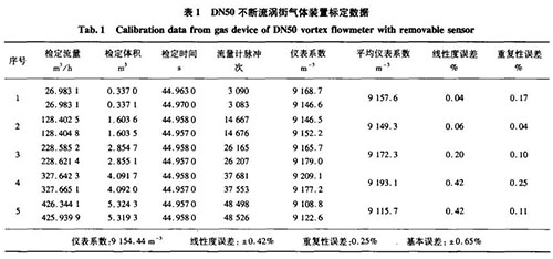 在實(shí)際標(biāo)定過程中,相同口徑的不斷流渦街與普通氣體渦街流量計(jì)在可測(cè)流量范圍、基本誤差、重復(fù)性等參數(shù)上基本一致,達(dá)到了設(shè)計(jì)和使用精度的要求。