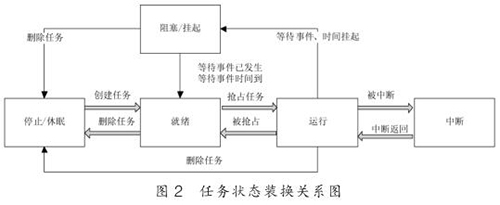 μC/OS-III 中的每一個任務(wù)都是無限循環(huán)的 。 每個任務(wù)會有五種狀態(tài),并且處于五種狀態(tài)之一。 這五種狀態(tài)分別是:睡眠態(tài)、就緒態(tài)、運行態(tài)、等待態(tài)以及中斷服務(wù)態(tài)。 睡眠態(tài)是指任務(wù)只是以代碼的形式存在于程序空間, 并未交給操作系統(tǒng)進(jìn)行管理; 就緒態(tài)是指系統(tǒng)為任務(wù)配備了任務(wù)控制塊且在任務(wù)就緒表中進(jìn)行了就緒登記,使任務(wù)具備了運行的充分條件;運行態(tài)是指處于就緒態(tài)的任務(wù)如果經(jīng)調(diào)度器判斷獲得了 CPU 的使用權(quán)時的狀態(tài);等待態(tài)則是正在運行的任務(wù),需要等待一段時間或需要等待一個事件發(fā)生再運行; 中斷服務(wù)狀態(tài)是指一個正在運行的任務(wù)一旦響應(yīng)中斷申請就會中止運行而去執(zhí)行中斷服務(wù)程序。這五種狀態(tài)在系統(tǒng)管理下的轉(zhuǎn)換關(guān)系由圖 2 所示。