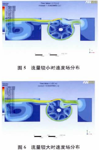 (1)數(shù)值仿真結(jié)果與物理實(shí)驗(yàn)結(jié)果基本一致,當(dāng)流速低于啟動排量,渦輪未啟動時,流體沿葉片做繞角運(yùn)動,葉片兩側(cè)壓力相等,葉片不轉(zhuǎn)動;當(dāng)流速高于啟動排量,渦輪轉(zhuǎn)動時,流體在腔內(nèi)產(chǎn)生旋渦,造成葉片兩邊壓差,從而造成葉片轉(zhuǎn)動。