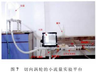 為了驗(yàn)證仿真的準(zhǔn)確性,通過室內(nèi)實(shí)驗(yàn)對其驗(yàn)證。切向渦輪采用可視化研究平臺,整個渦輪的結(jié)構(gòu)都采用亞克力板雕刻組裝而成。如圖7所示,水箱主要提供穩(wěn)定水壓,水平切向渦輪做成開口系統(tǒng)并放置在實(shí)驗(yàn)支撐架上,前置閥門可控制水流,在需要更換切向渦輪的零件時可關(guān)閉,控制閥門主要是控制流經(jīng)切向渦輪的流量,流量測量仍采用傳統(tǒng)可靠的容積時間法。實(shí)驗(yàn)時以染色劑作為示蹤劑,以觀察流場的分布情況。