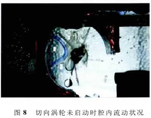 如圖8所示,記錄的是未啟動時切向渦輪內(nèi)的流場,水從圖8左側(cè)流入渦輪,從右側(cè)流出,實(shí)驗(yàn)時水的流速很低(0.05m3/d),腔體1中的流動可近似看作不可壓縮無旋繞角流動,此時流體在腔體1中的速度可看成對稱分布,由伯努利方程算得的壓強(qiáng)也是對稱分布,此時2個壁面幾乎沒有壓強(qiáng)差,所以渦輪未啟動。