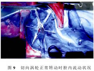 圖9記錄的是切向渦輪正常轉(zhuǎn)動時的流場,圖9中水從左向右流動,實(shí)驗(yàn)時水速較快(1m3/d),渦輪葉片順時針轉(zhuǎn)動。水速變大后,擾動變大,不再是無旋繞角流動,腔體1中流體形成一個運(yùn)動的旋渦,導(dǎo)致腔內(nèi)壓強(qiáng)分布不再對稱,產(chǎn)生壓差,致使渦輪葉片轉(zhuǎn)動,旋渦在隨葉片運(yùn)動到腔體2中時逐漸耗散消失。數(shù)值仿真的計算結(jié)果與物理實(shí)驗(yàn)的結(jié)果基本一致。