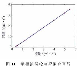 采用同樣的方法,對單相油條件下渦輪響應(yīng)規(guī)律進(jìn)行研究(見圖11),測得單相油的啟動排量為0.08m3/d。對單相油的實(shí)驗(yàn)結(jié)果進(jìn)行擬合,可得單相油的響應(yīng)曲線為ω=6.73Q-6.72。與水對比而言,油的擬合曲線斜率更大,即隨著流量增加轉(zhuǎn)速增加得略快。