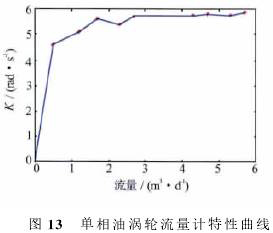 可以看出,渦輪啟動后*先進(jìn)入一個非線性段,在非線性相應(yīng)段,K值隨著流量增加而增大;當(dāng)流量比較大(單相水超過0.5m3/d,單相油超過1m3/d)時,渦輪進(jìn)入線性段,在線性響應(yīng)段,K值達(dá)到峰值,有相對較小的波動。