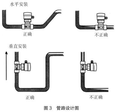 現(xiàn)場安裝時應(yīng)注意遠離可能對其產(chǎn)生干擾的大型設(shè)備,防止長期的熱輻射和其他如磁場直射等環(huán)境影響。為確保高測量精度和較好的零點穩(wěn)定性,進行校正前,智能型電磁流量計應(yīng)裝入工藝介質(zhì)中至少 24 小時電極鈍化。安裝的管路設(shè)計應(yīng)確保管道始終充滿流體,防止測量誤差,管路設(shè)計圖見圖 3。