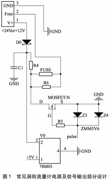 從圖1 中可以看到,供電電源 +24 V, +12 V均可,直流電源通過瓷片電容 C1 濾掉部分紋波,然后通過線性穩(wěn)壓芯片 78M05,得到 + 5 V 電壓,為后面的渦街蒸汽流量計(jì)信號處理電路供電,若要再得到 3. 3 V 電壓,通常會在 78M05 后再加一片線性穩(wěn)壓芯片 LM1117-3. 3,為了節(jié)約成本,供電電路沒有做 EMS 設(shè)計(jì)。同時,脈沖輸出部分,僅通過一個 MOS 管和兩個穩(wěn)壓管,也沒有 EMS 方面的設(shè)計(jì)考慮。