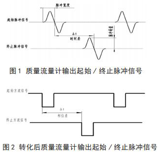 將高壓電磁流量計流量與相關測試設備連接起來,就可以進行高壓電磁流量計的校準,時間差△ t 由專用試驗測試設備可以測出。起始脈沖信號和終止脈沖信號如圖 1 所示。經過專用試驗測試設備信號轉化后的信號方波如圖 2 所示。