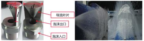 圖 1 為電弧風扇噴嘴的結構和噴霧,一種新型的噴嘴主要由一個衛生型渦街流量計入口、出口和導流葉片組成。出流口的圓柱形設計降低了湍流強度。導流葉片類似于流線型尾部,產生類似于弧形風扇形狀的衛生型渦街流量計噴霧,其形狀類似于掘進機的粉塵源。