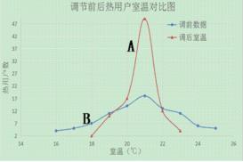 我公司在該小區管網改造前,在不同單元不同樓層分別安裝100臺室溫采集器。渦街氣體流量計調前數據采集于2017~2018年供熱期,調后數據采集于2018~2019年供熱期。經過兩個采暖期,共有96臺室溫采集器可以正常提供數據。數據分析結果見圖3所示。