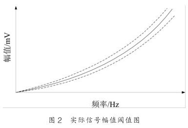 其中 c 為系數, δ 為相對誤差限, 其示意圖如圖 2 所示,圖中實線為幅頻關系的理論擬合曲線, 而虛線為幅值波動的閾值曲線。根據實驗的數據,渦街信號幅值波動的相對誤差為 ±10% 。