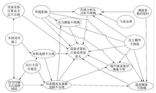 制藥廠污水流量計(jì)量系統(tǒng)計(jì)量的準(zhǔn)確性既與制藥廠污水流量計(jì)本體有關(guān),也和壓力、溫度測(cè)量儀表、色譜分析儀以及流量計(jì)算機(jī)等設(shè)備的可靠性有直接關(guān)系。此外,在員工操作、環(huán)境影響、設(shè)計(jì)選型、設(shè)備安裝等方面也會(huì)一定程度影響制藥廠污水流量計(jì)量的準(zhǔn)確性,其影響因素復(fù)雜多樣。電磁計(jì)量系統(tǒng)計(jì)量準(zhǔn)確性影響因素關(guān)聯(lián)關(guān)系如圖2所示。在實(shí)際生產(chǎn)應(yīng)用中,對(duì)制藥廠污水流量計(jì)量準(zhǔn)確性造成較大影響的主要是噪音、液體計(jì)量雜質(zhì)、氣體組分分析以及壓力、溫度測(cè)量這四個(gè)方面。